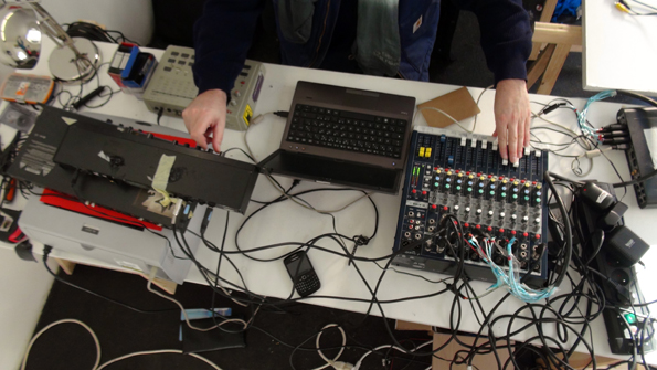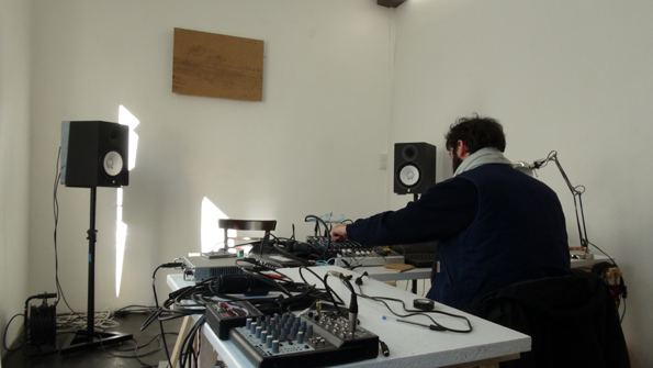 Le travail de création sonore se pensant par couches, la musique s’additionne alors avec la réalité. Le processus du workshop était quant à lui visible dans la galerie par la présentation de matériaux et éléments de travail préparatoires (cartes, brouillons, photographies, vidéos).